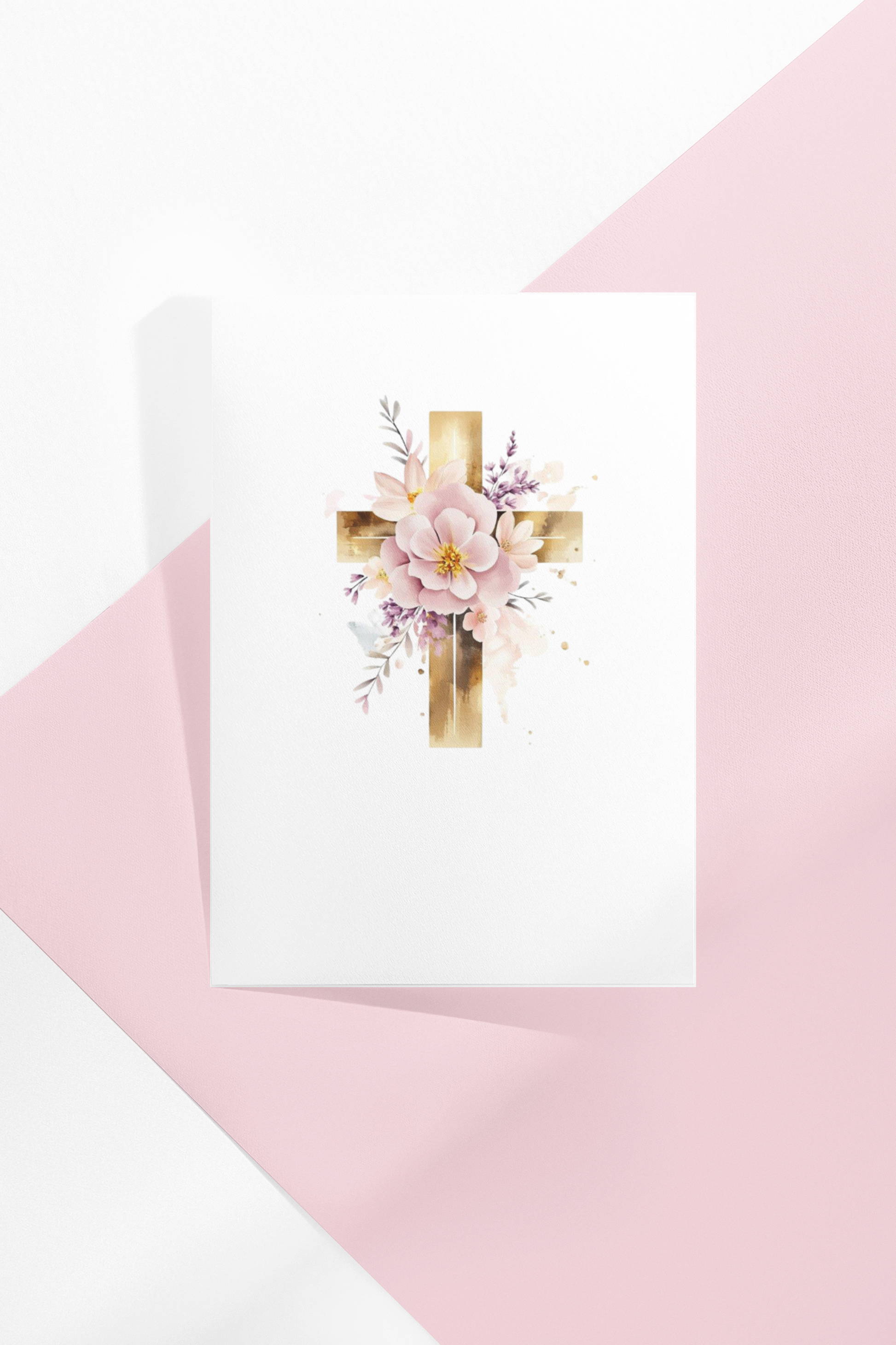 Zartes Aquarell trifft auf Glauben: Das stilisierte goldene Kreuz, geschmückt mit sanften Blüten, macht diese Karte zu einem besonderen Gruß für Taufe, Kommunion oder Firmung.