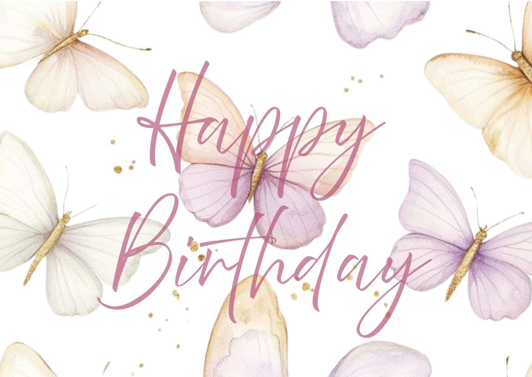 Zarte Aquarell-Schmetterlinge in Rosé, Flieder und Goldakzenten tanzen über diese elegante Geburtstagskarte – ein liebevoller Gruß für besondere Menschen.