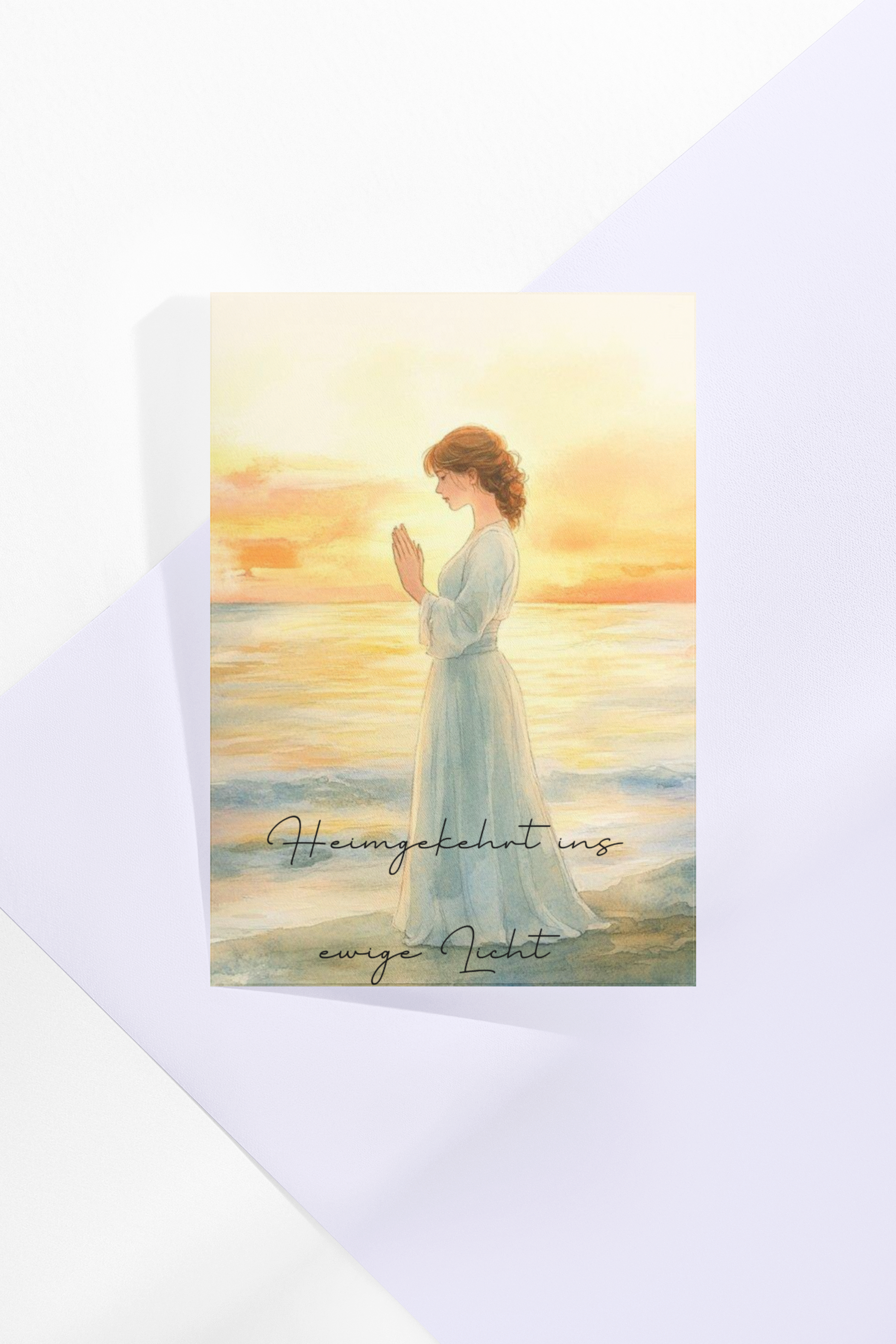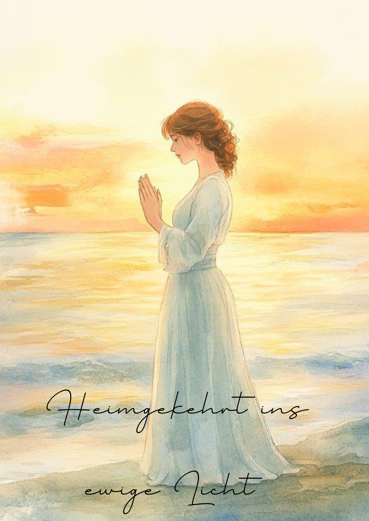 Diese sanft illustrierte Trauerkarte mit dem Sonnenuntergang am Meer und der betenden Frau steht für einen friedvollen Abschied und die Hoffnung auf ein Licht, das niemals erlischt.