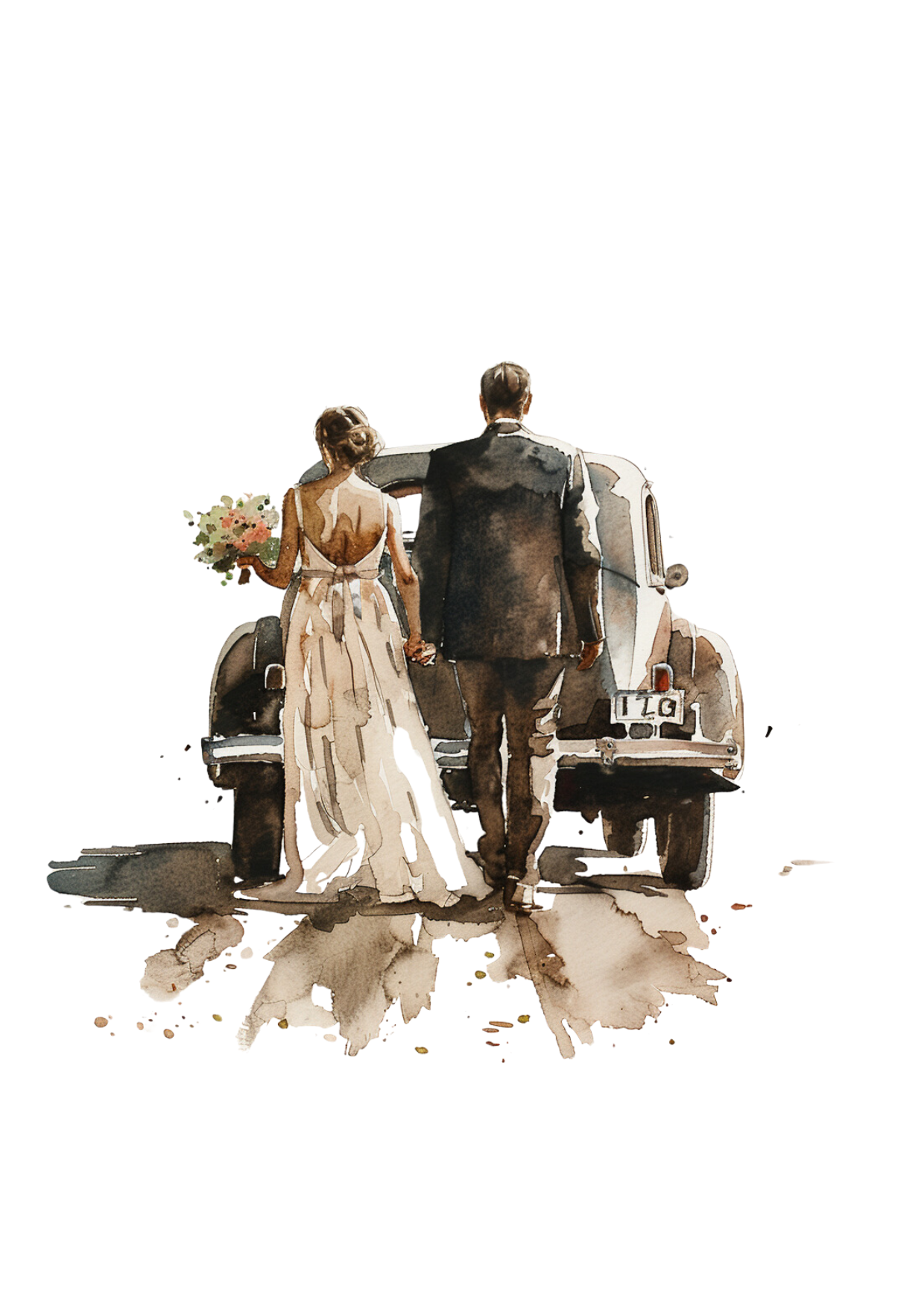 Diese elegante Grußkarte zeigt ein frisch vermähltes Paar auf dem Weg in eine gemeinsame Zukunft – stilvoll, romantisch und zeitlos.