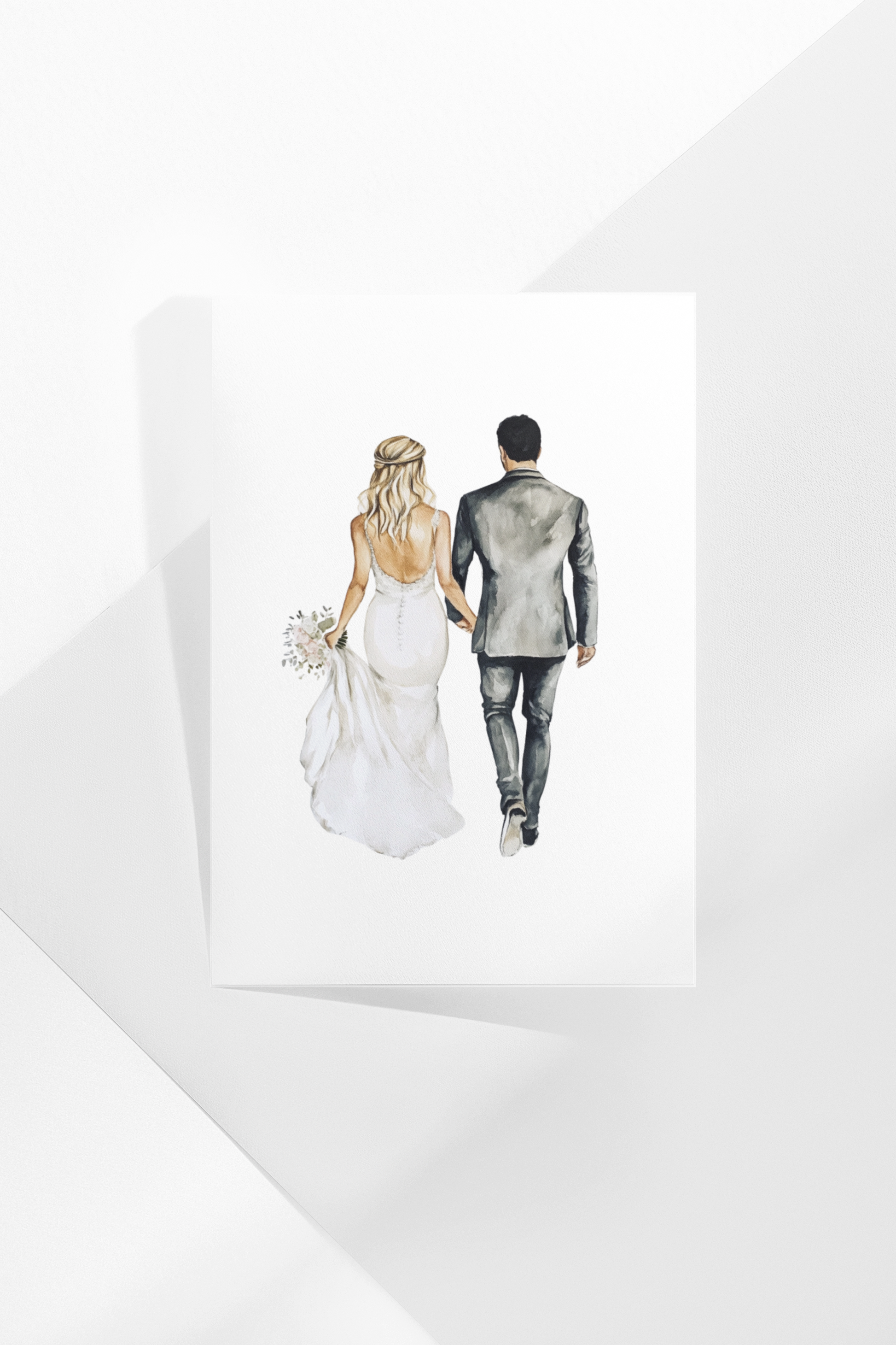 Ein Brautpaar, vereint im Moment – dieses stilvolle Aquarellmotiv fängt die Magie des großen Tages ein.