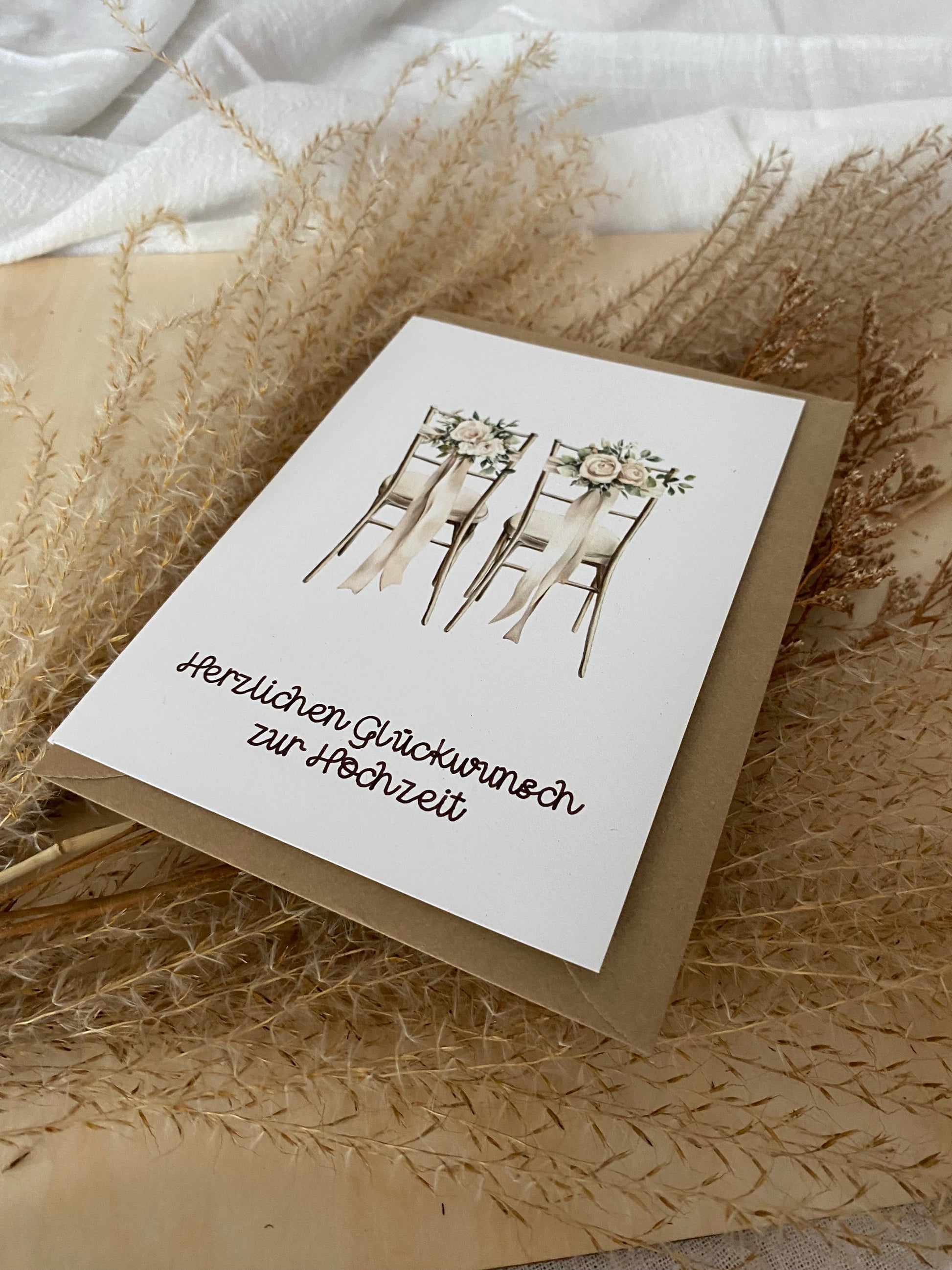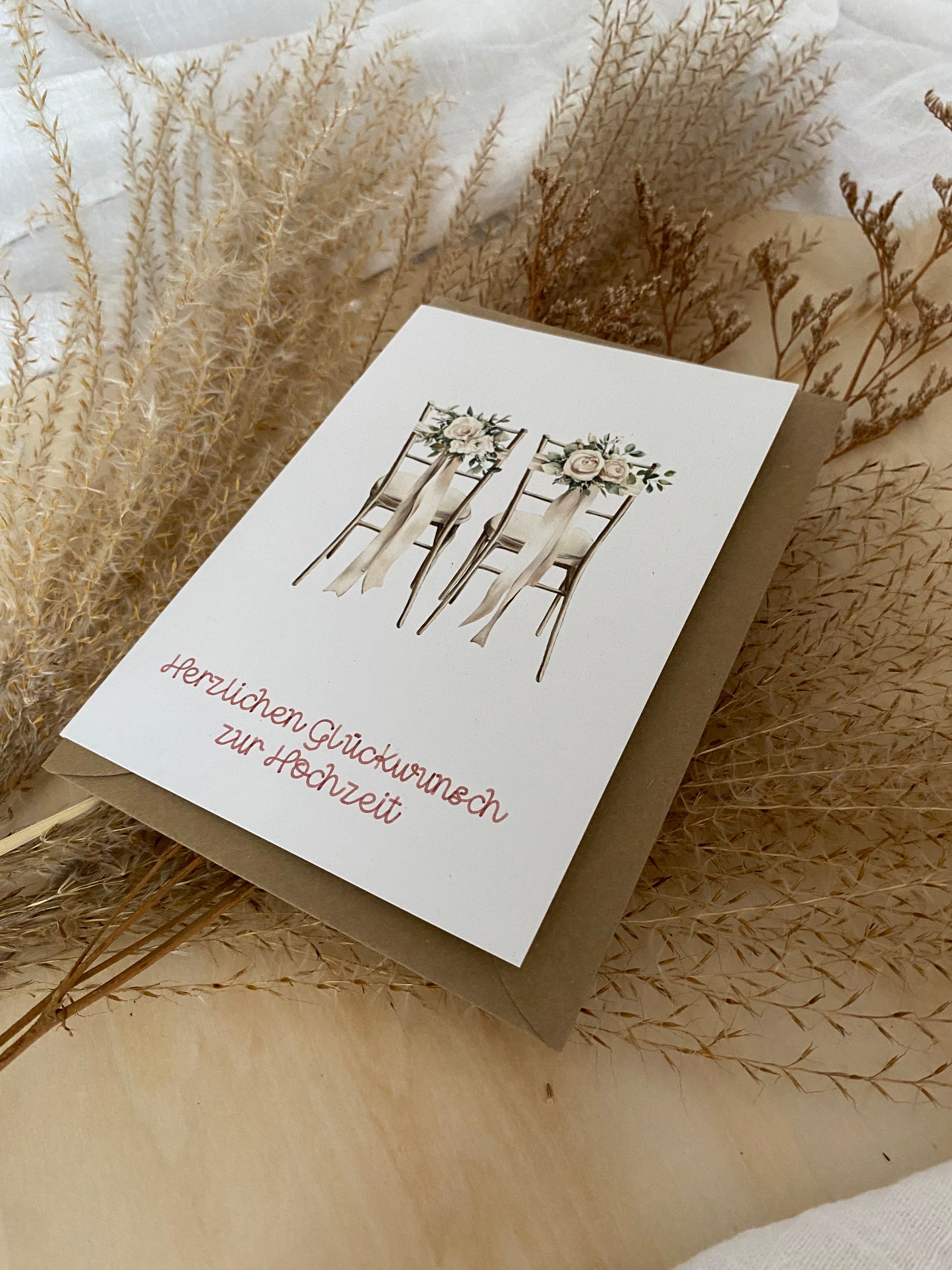 Diese liebevoll illustrierte Hochzeitskarte ist ein stilvoller Gruß zur Trauung, zum Hochzeitstag oder zur Verlobung.