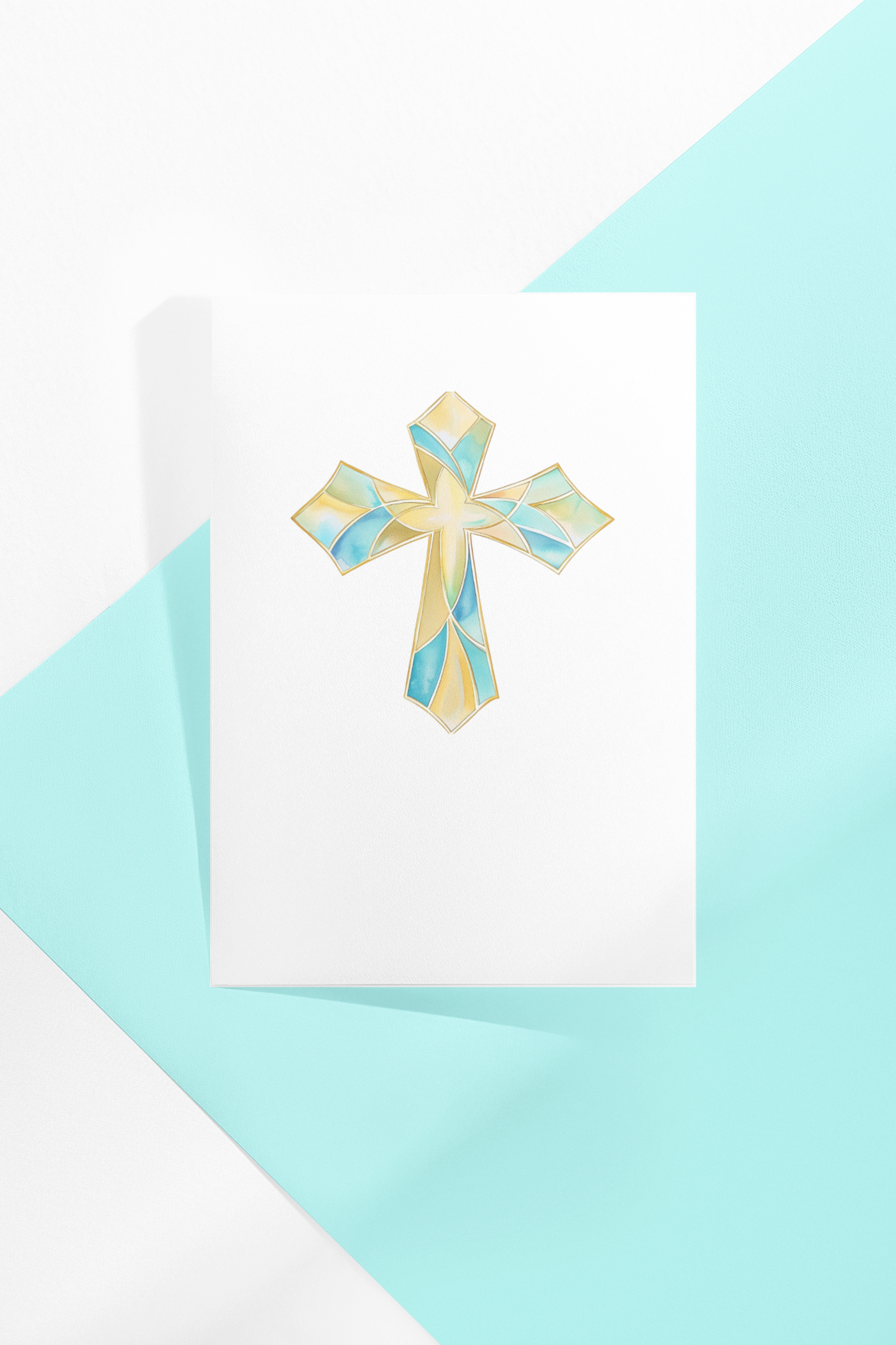 Ein zart schimmerndes Kreuz in sanften Aquarelltönen symbolisiert Hoffnung, Glaube und Schutz.