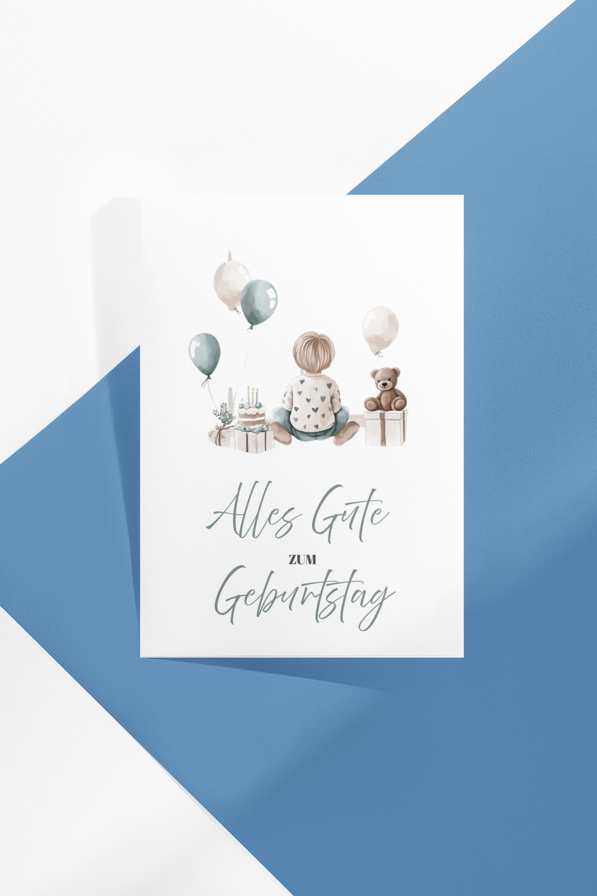 Ein kleiner Junge, umgeben von Ballons, Geschenken und einer Geburtstagstorte – dieses sanfte, detailverliebte Motiv macht die Geburtstagskarte zu etwas ganz Besonderem.