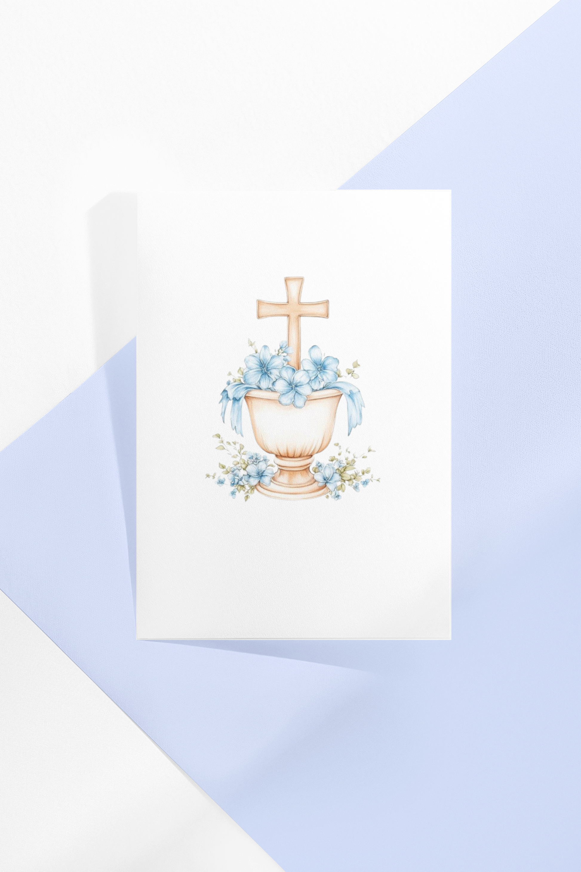 Ein stilvoll illustriertes Taufbecken mit Kreuz und zarten Blüten in hellblau – diese Grußkarte ist ein liebevoller Begleiter für einen der bedeutendsten Tage im Leben: die heilige Taufe.