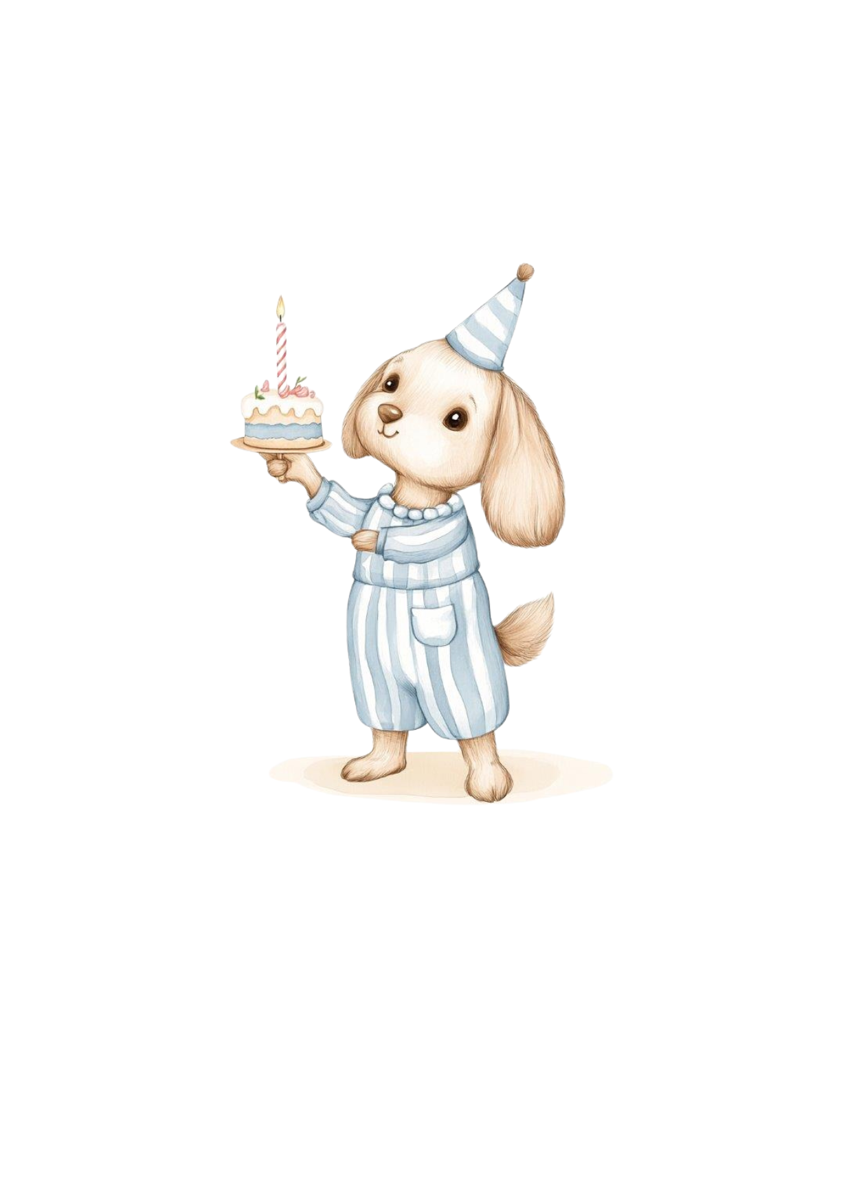 Ein kleiner Hund im gestreiften Pyjama und Partyhut bringt dir ein Törtchen mit Kerze – diese liebevoll illustrierte Geburtstagskarte ist ideal für Kinder oder Tierfreunde.