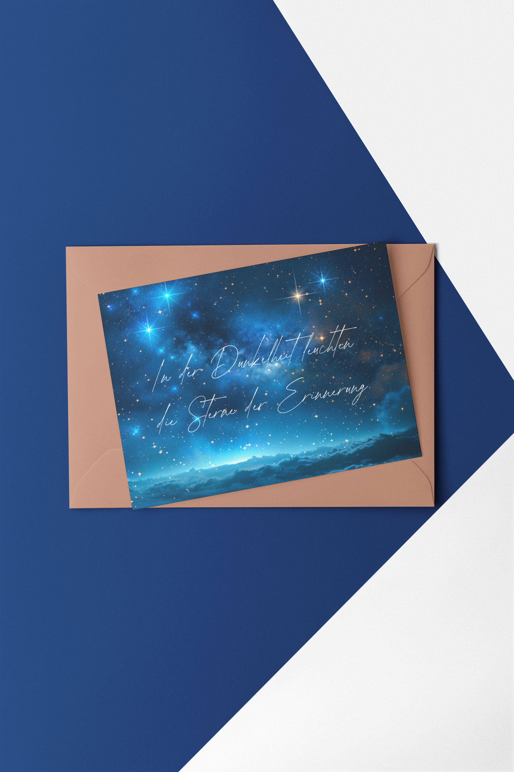 Diese stilvolle Trauerkarte mit einem leuchtenden Sternenhimmel spendet Trost und erinnert daran, dass geliebte Menschen nie ganz gehen – sie hinterlassen Spuren in unseren Herzen.