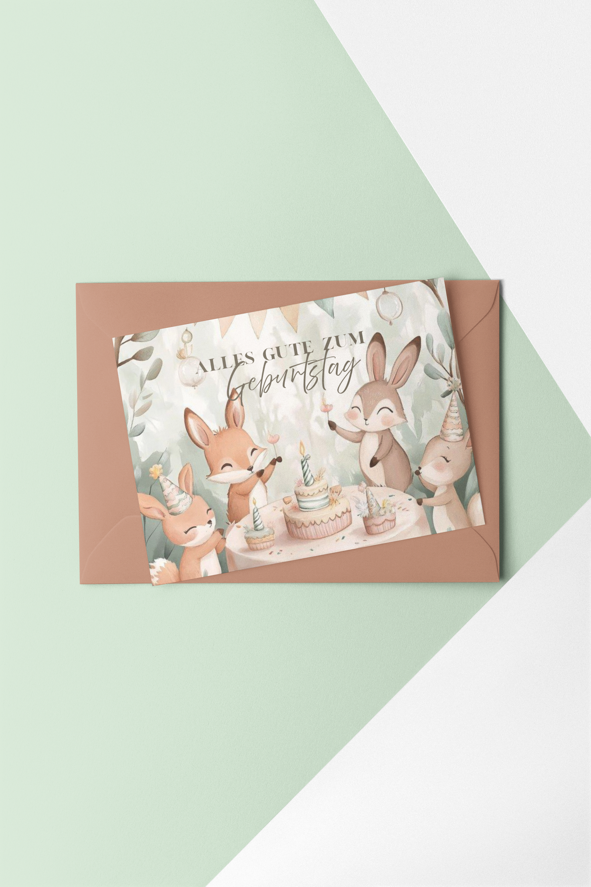 Diese liebevoll illustrierte Geburtstagskarte bringt tierisch süße Grüße – ideal für Kinder, Tierfreunde oder naturverbundene Menschen.